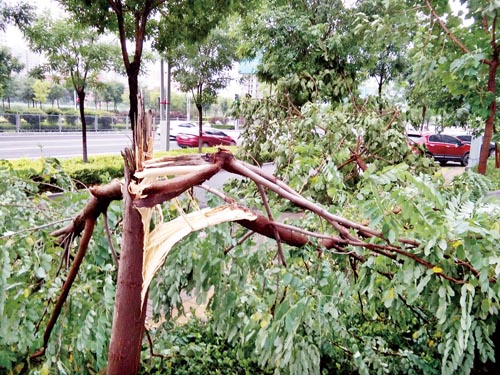 7月15日下午,忻州城區(qū)遭遇一場(chǎng)突如其來(lái)的暴風(fēng)雨襲擊,致使局部地區(qū)出現(xiàn)樹(shù)木被刮倒、樹(shù)枝被折斷、車(chē)輛被劃傷的現(xiàn)象。圖為忻州城區(qū)惠民小區(qū)院外道路邊的景觀樹(shù)被刮折。(魯明強(qiáng) 攝)