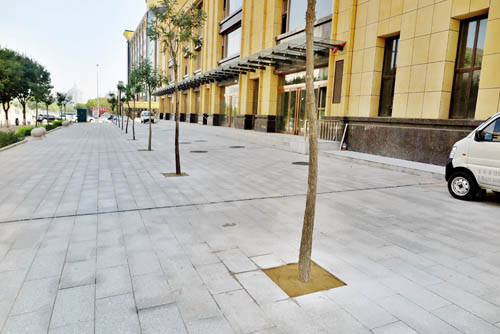 據(jù)了解,因為該臨街大樓是轉(zhuǎn)角建筑,相鄰七一路樓前還栽有13棵景觀樹,工人們將在7日下午為這些樹木切割設置相同規(guī)格的樹池。圖為有了澆水池的樹木(魯明強)
