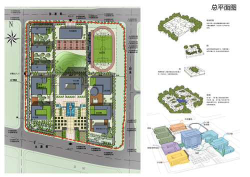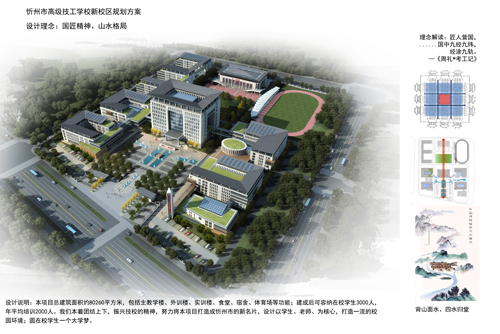 我們本著國匠精神-九宮格布局、山水格局-背山面水、四水歸堂的設(shè)計理念,團(tuán)結(jié)上學(xué)、振興技校的精神,努力將本項(xiàng)目打造成為忻州市的新名片,圓技校學(xué)生一個大學(xué)夢。我們注重整體空間的舒適性、藝術(shù)性,不強(qiáng)調(diào)過分統(tǒng)一。設(shè)計中注重細(xì)節(jié)處理和學(xué)生們行為模式的考慮;將環(huán)境氣氛和設(shè)施布置的更具有靈活性、親和力,適應(yīng)寬松、生活化的教學(xué)模式。