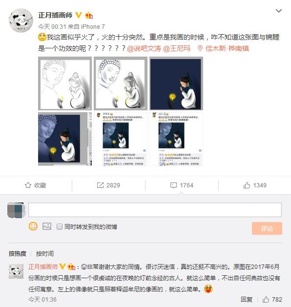 關(guān)于這張畫上的佛像到底是不是地藏菩薩,網(wǎng)友各說各話直到現(xiàn)在還有人在糾結(jié)。而其實(shí),插畫的原創(chuàng)作者@正月插畫師早在今天凌晨00:31分就已經(jīng)作出說明:畫的只是一個(gè)夜晚在燈前念經(jīng)的古人,佛像照釋迦摩尼所畫,不出自任何典故也沒有任何寓意!