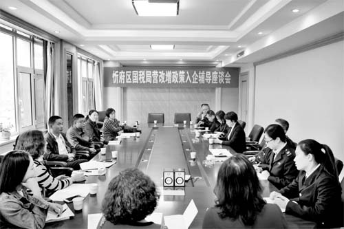 本報訊 4月19日下午,忻府區(qū)國稅局營改增政策入企輔導座談會在忻州國力房地產(chǎn)開發(fā)有限公司會議室召開。區(qū)局黨組書記、局長郭靜出席,政策法規(guī)科科長王繼紅主持會議,稅源管理科負責人和房地產(chǎn)企業(yè)代表一同參加。