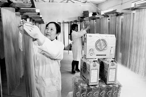 7月20日,工人正在晾曬生產出的“河撈面”。始制于北宋年間的五臺縣民間美食“河撈面”,如今又被該縣豆村鎮(zhèn)列為產業(yè)扶貧項目。在當地,一個由興坪村“霞輝”玉米加工專業(yè)合作社生產出的玉米、高粱、蕎麥、大豆等12類盒裝與袋裝產品,已俏銷太原、忻州等食品市場,年產值達56萬元。(金俊賢 攝)
