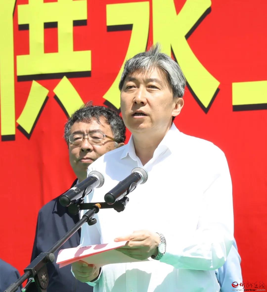 朱曉東出席主會(huì)場(chǎng)活動(dòng)并講話。范濤 攝 朱曉東代表市委市政府對(duì)工程開(kāi)工表示熱烈祝賀,向一直以來(lái)關(guān)心支持忻州水利事業(yè)的各級(jí)各部門表示衷心感謝。他說(shuō),水是生命之源、生產(chǎn)之要、生態(tài)之基,加快水利建設(shè)對(duì)忻州具有特殊重要意義。實(shí)施縣域小水網(wǎng)供水工程是忻州“五水綜改”進(jìn)程中的一件大事,也是忻州水利建設(shè)史上的一件要事,更是群眾期盼多年的一件實(shí)事。它有利于統(tǒng)籌水資源配置,有利于補(bǔ)齊西部縣缺水短板,更有利于為縣域經(jīng)濟(jì)持續(xù)健康發(fā)展提供重要的支撐和保障。 朱曉東強(qiáng)調(diào),開(kāi)工僅僅是起點(diǎn),大量工作才剛剛開(kāi)始。為確保工程盡快建成受益,我們要提高站位抓落實(shí)。實(shí)施縣域小水網(wǎng)供水工程,是踐行習(xí)近平總書記重要治水思想,貫徹全省“五水綜改”戰(zhàn)略部署和推動(dòng)全市高質(zhì)量高速度趕超型跨越式發(fā)展的具體舉措。能否抓好這項(xiàng)工作,考驗(yàn)的是我們的政治能力和政治擔(dān)當(dāng),我們一定要以高度的政治責(zé)任感和歷史使命感,統(tǒng)籌推進(jìn)水災(zāi)害防治、水資源節(jié)約、水生態(tài)保護(hù)、水環(huán)境治理,認(rèn)真做好各項(xiàng)工作,著力提升工程效益,真正交出合格答卷。我們要真抓實(shí)干提效率。無(wú)論是市直部門,還是項(xiàng)目投資方、建設(shè)方都要咬定目標(biāo),心往一處想、勁往一處使,把高質(zhì)量高效率的要求貫穿工程建設(shè)全過(guò)程各環(huán)節(jié),緊緊抓住當(dāng)前施工的黃金期,盯緊時(shí)間節(jié)點(diǎn),強(qiáng)化專班推進(jìn),做實(shí)三保一控,真正把縣級(jí)換屆換出來(lái)的新氣象彰顯出來(lái),把干部群眾加快發(fā)展的活力激發(fā)出來(lái),提速?zèng)_刺,真抓實(shí)干,確保8座調(diào)蓄水庫(kù)工程以及飲水供水工程今年年底前全部建成。我們要凝心聚力出精力。各縣要樹(shù)牢大局意識(shí),強(qiáng)化結(jié)果導(dǎo)向,扎實(shí)搞好服務(wù)保障,既要做到工程建設(shè)零干擾,又要認(rèn)真解決好沿線群眾的生產(chǎn)生活問(wèn)題。各職能部門要?jiǎng)?chuàng)新思路,破解難題,創(chuàng)造良好的建設(shè)條件。各建設(shè)單位要嚴(yán)格落實(shí)項(xiàng)目法人責(zé)任制、項(xiàng)目建設(shè)監(jiān)理制,確保工程安全和質(zhì)量,真正打造一流工程、精品工程和民心工程,共同做好忻州科學(xué)興水治水大文章。
