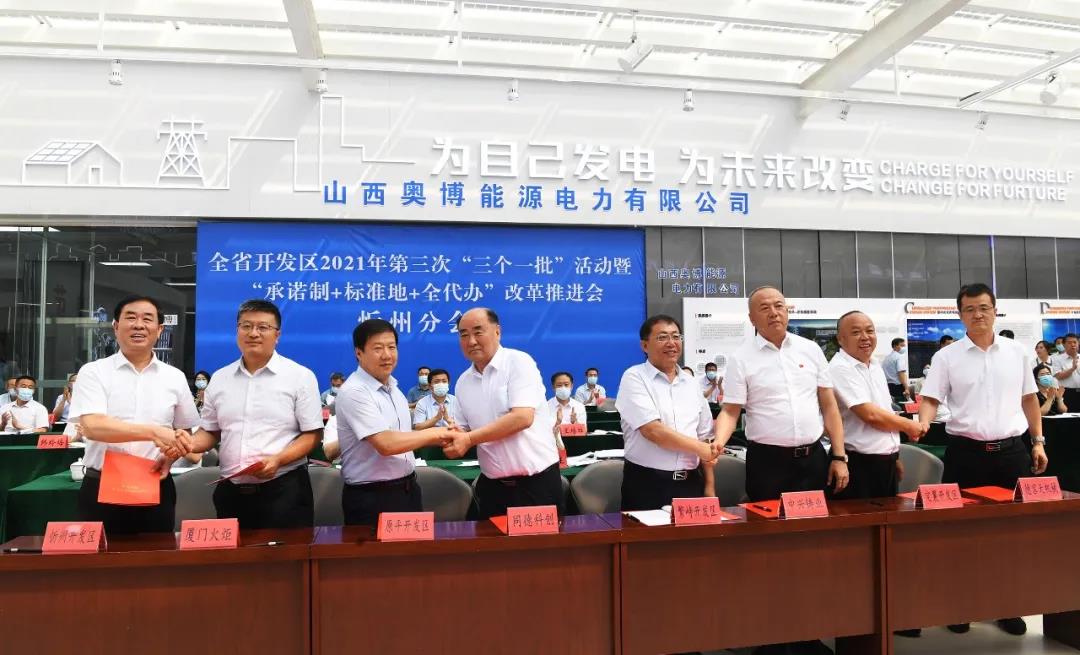 忻州分會場。劉紀(jì)森 攝 本報訊 (記者楊峰雷)7月16日,全省開發(fā)區(qū)2021年第三次項目集中簽約一批、開工一批、投產(chǎn)一批“三個一批”活動暨“承諾制+標(biāo)準(zhǔn)地+全代辦”改革推進會通過視頻連線方式舉行。我市作為分會場同步舉行相關(guān)活動,市委書記鄭連生在忻州分會場出席,市委副書記、市長朱曉東主持忻州分會場簽約儀式。市委常委、秘書長裴峰,副市長范建民在忻州分會場出席。 滾動開展“三個一批”活動,是省委、省政府建強開發(fā)區(qū)主戰(zhàn)場主引擎的重大部署,對培育壯大產(chǎn)業(yè)、有效支撐轉(zhuǎn)型發(fā)展發(fā)揮了重要作用。著眼全方位推動項目工作,我省先后開展了項目承諾制改革試點、“標(biāo)準(zhǔn)地”改革、“全代辦”改革,有力破解了項目建設(shè)審批中存在的各類難題。為進一步打好改革“組合拳”,加快形成改革綜合效應(yīng),今年以來我省在開發(fā)區(qū)大力推行“承諾制+標(biāo)準(zhǔn)地+全代辦”改革,進一步激發(fā)了市場主體活力,增添了轉(zhuǎn)型發(fā)展動能。 今年以來,全市開發(fā)區(qū)以“開局即決戰(zhàn)、起跑即沖刺”的責(zé)任感和緊迫感,以“四比四看”為抓手,比學(xué)趕超,持續(xù)推進項目建設(shè)。此次全市開發(fā)區(qū)“三個一批”活動,共簽約項目46個,總投資171.49億元;開工項目43個,總投資95.68億元,其中戰(zhàn)略性新興產(chǎn)業(yè)項目25個,占比58.1%;投產(chǎn)項目19個,總投資20.65億元,其中戰(zhàn)略性新興產(chǎn)業(yè)項目4個,占比21.05%。