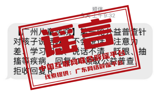 真相:近期,有社會(huì)醫(yī)療機(jī)構(gòu)冒用廣州市婦女兒童醫(yī)療中心(以下簡(jiǎn)稱(chēng)“廣州婦兒中心”)名稱(chēng),通過(guò)群發(fā)短信的方式,宣傳該中心正在進(jìn)行“身高普查”“針對(duì)孩子說(shuō)話(huà)晚,不會(huì)說(shuō)話(huà)、注意力差等”等公益普查項(xiàng)目。對(duì)此,廣州婦兒中心發(fā)布聲明稱(chēng),目前,該中心未就上述公益普查項(xiàng)目與其他任何醫(yī)療機(jī)構(gòu)或社會(huì)組織存在合作關(guān)系,也未曾通過(guò)短信、電話(huà)向廣大患者推送過(guò)醫(yī)療信息。特此提醒廣大市民,切勿輕信此類(lèi)信息,并注意保護(hù)個(gè)人隱私。(來(lái)源:廣東省互聯(lián)網(wǎng)舉報(bào)中心)