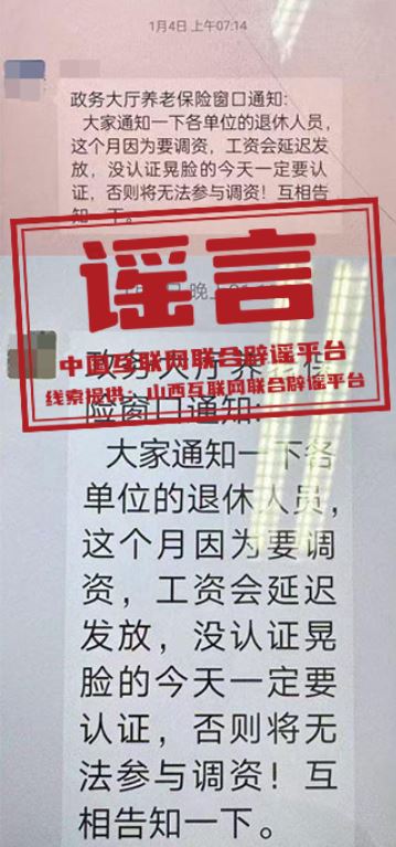 真相:近日,部分網(wǎng)絡(luò)平臺陸續(xù)出現(xiàn)所謂“成都地鐵內(nèi)推、直簽、提前預(yù)定名額、包通過率”“濟南地鐵校園招聘有‘真題’、在線筆試一把過”等信息,引發(fā)關(guān)注。對此,成都軌道集團、濟南軌道交通集團均回應(yīng)稱,從未授權(quán)或委托任何中介、個人或培訓(xùn)機構(gòu)等第三方組織任何形式的招聘考試輔導(dǎo)或培訓(xùn),也未向任何第三方提供所謂的“真題”或“題庫”,且在招聘過程中不存在收取任何形式的報名費、中介費、手續(xù)費等或要求應(yīng)聘者繳納任何形式的押金、保證金、活動費等行為。所有以“直簽”“內(nèi)推”“預(yù)定名額”“保通過率”為噱頭發(fā)布的信息均為虛假信息。請廣大應(yīng)聘者、考生及市民朋友注意甄別,謹(jǐn)防受騙。(來源:四川互聯(lián)網(wǎng)舉報辟謠平臺、山東互聯(lián)網(wǎng)聯(lián)合辟謠平臺、成都網(wǎng)絡(luò)辟謠、濟南互聯(lián)網(wǎng)聯(lián)合辟謠平臺) 謠言:山西大同“退休人員今天一定要認(rèn)證,否則將無法參與調(diào)資”?