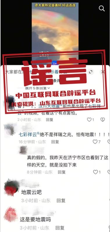 真相:近日,山東濟(jì)寧多地市民觀察到天空中出現(xiàn)大片色彩斑斕、形態(tài)似羽毛或波浪的云層,許多人稱(chēng)之為“祥云”,有部分網(wǎng)民將它與“地震預(yù)測(cè)”的民間說(shuō)法相關(guān)聯(lián),稱(chēng)是“地震云”“不是祥瑞之兆,是要地震”。