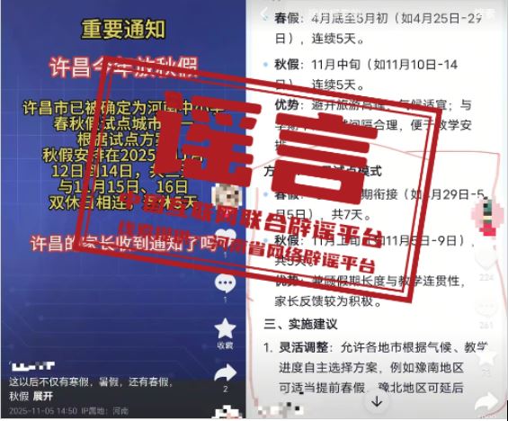 真相:近日,河南、安徽部分自媒體平臺(tái)發(fā)布關(guān)于中小學(xué)春秋放假的信息,聲稱“許昌市已被確定為河南中小學(xué)春秋假試點(diǎn)城市之一”“周口市中小學(xué)2025年秋假時(shí)間安排如下”“蕪湖市中小學(xué)將在11月12日至14日放首個(gè)秋假,連周末共5天”,引發(fā)關(guān)注。對此,河南許昌、周口及安徽蕪湖教育部門作出回應(yīng):并無放秋假的安排,網(wǎng)傳消息均為謠言。中小學(xué)放假安排需嚴(yán)格遵循國家教育方針政策及當(dāng)?shù)亟逃块T的統(tǒng)一部署,結(jié)合本地教育教學(xué)實(shí)際統(tǒng)籌規(guī)劃。如需了解相關(guān)安排,請通過屬地教育部門官方網(wǎng)站,切勿輕信、傳播未經(jīng)官方確認(rèn)的“小道消息”。(來源:“清朗河南”微信公眾號(hào)、@大河網(wǎng)、安徽網(wǎng)絡(luò)辟謠平臺(tái))