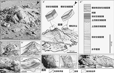 相比地球而言,火星只有兩顆小衛(wèi)星,使得其表面具有低能量的潮汐系統,在這種潮汐環(huán)境中只能形成小規(guī)模的層理構造。同時,研究中識別的底形和沉積構造具有支持其為流水沉積而非風成沉積的證據。