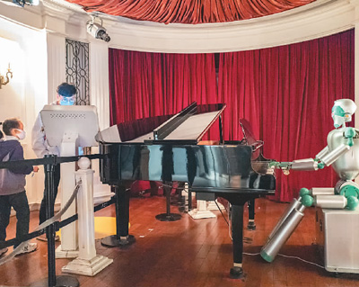 在上海科技館,游客觀看機(jī)器人彈琴。王 初攝(人民圖片)