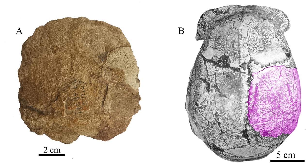 周口店第15號地點(diǎn)發(fā)現(xiàn)的人類頂骨化石。左側(cè):頂骨化石外側(cè)面觀;右側(cè):周口店直立人頭蓋骨模型頂面觀,示頂骨化石位置。中國科學(xué)院供圖