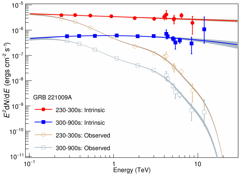 “拉索”測量的GRB 221009A在230-300秒和300-900秒兩段時(shí)間的伽馬射線能譜。(中國科學(xué)院高能物理研究所供圖)