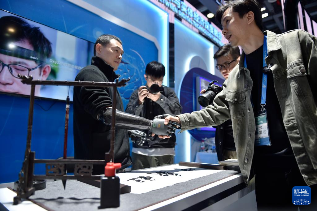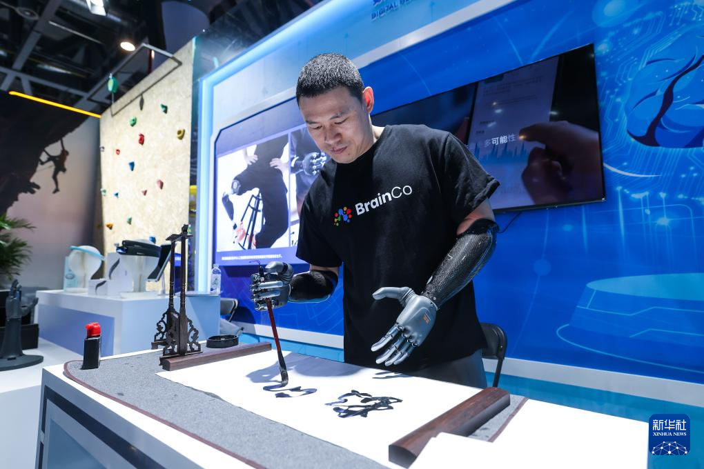 11月23日,在第二屆全球數(shù)字貿(mào)易博覽會(huì)上,觀眾在前沿趨勢館體驗(yàn)與穿戴智能仿生手的參展人員握手。新華社記者劉嶺逸攝 新華社杭州11月26日電 在一個(gè)展館中布置的室內(nèi)攀巖墻上,一名右下肢截肢的人士靈巧展示攀巖技能。他使用的基于腦機(jī)接口技術(shù)的智能仿生腿,不僅幫助他恢復(fù)日常行走能力,就像室內(nèi)攀巖這種較高強(qiáng)度活動(dòng)也能輕松完成。 第二屆全球數(shù)字貿(mào)易博覽會(huì)23日至27日在杭州舉行。本屆博覽會(huì)上不僅有華為、阿斯利康、松下等國內(nèi)外企業(yè)展示制藥、人工智能、智能制造等領(lǐng)域的新技術(shù)和新應(yīng)用,像強(qiáng)腦科技有限公司這樣專注腦機(jī)接口技術(shù)的公司也備受關(guān)注。 腦機(jī)接口經(jīng)過國內(nèi)外科研團(tuán)隊(duì)多年開發(fā),已取得不少進(jìn)展,目前有兩大技術(shù)路徑。美國企業(yè)家埃隆·馬斯克旗下的腦機(jī)接口公司“神經(jīng)連接”專注于侵入式腦機(jī)接口技術(shù),探索帕金森、重度癱瘓等疾病的治療;強(qiáng)腦科技等一些企業(yè)則專注于挖掘非侵入式腦機(jī)接口技術(shù)的應(yīng)用。 在強(qiáng)腦科技展位上展示室內(nèi)攀巖能力的林國秋告訴記者,他小時(shí)候因意外受傷而右下肢截肢,此前使用過很多國際品牌的假肢,但效果一般。后來,他有機(jī)會(huì)嘗試強(qiáng)腦科技開發(fā)的智能仿生腿,并加入這家公司成為產(chǎn)品體驗(yàn)官,與研究人員一起開發(fā)產(chǎn)品。 林國秋說,他使用這款基于非侵入式腦機(jī)接口技術(shù)的智能仿生腿產(chǎn)品已經(jīng)3年了,不但恢復(fù)了正常行走能力,熱愛運(yùn)動(dòng)的他還考取了健身教練證,經(jīng)常參加室內(nèi)攀巖運(yùn)動(dòng)。智能仿生腿一次充電可持續(xù)使用數(shù)天,已經(jīng)有計(jì)劃近期推向市場。 據(jù)強(qiáng)腦科技介紹,這款智能仿生腿可以通過傳感器實(shí)時(shí)采集數(shù)據(jù),經(jīng)算法處理后轉(zhuǎn)化為指令,控制產(chǎn)品的液壓系統(tǒng),從而能針對(duì)使用者的運(yùn)動(dòng)狀況進(jìn)行動(dòng)態(tài)的實(shí)時(shí)適配,滿足下肢截肢人士在日常生活場景中所需的動(dòng)作自由度,讓他們可以像控制自己的腿一樣控制智能仿生腿自由行走。 在展位現(xiàn)場,另一名上肢截肢的人士在使用強(qiáng)腦科技推出的智能仿生手。這也是基于非侵入式腦機(jī)接口技術(shù)的產(chǎn)品。使用者利用智能仿生手不但可輕松取物,還能寫毛筆字。