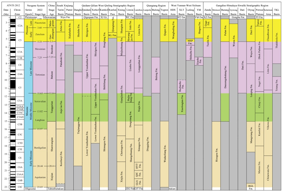 中國的新近紀(jì)年代地層系統(tǒng)分為中新統(tǒng)的謝家階、山旺階、通古爾階、灞河階、保德階5個(gè)階,以及上新統(tǒng)的高莊階和麻則溝階2個(gè)階。研究提出,在青藏高原新生代陸相地層的劃分對(duì)比和測(cè)年標(biāo)定上,哺乳動(dòng)物化石起到非常重要的作用。