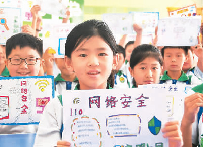 河北省邯鄲市永年區(qū)洺州小學(xué)的孩子們展示網(wǎng)絡(luò)安全手抄報(bào)。胡高雷攝(人民視覺)