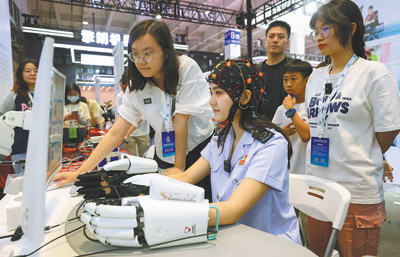 觀眾在北京舉辦的世界機(jī)器人博覽會上體驗(yàn)人工智能多模態(tài)腦機(jī)接口平臺。陳曉根攝(人民視覺)