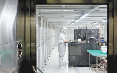 穿上防塵服,再經(jīng)過兩次噴淋除塵,記者才能進(jìn)入創(chuàng)新中心的芯片封裝測(cè)試驗(yàn)證平臺(tái)。