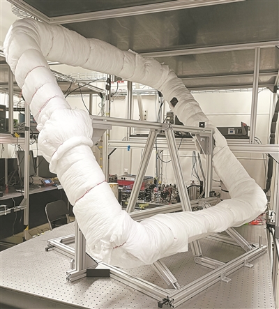 薩格納克干涉儀2公里長的光纖纏繞在邊長1.4米的方形鋁制框架上。圖片來源:奧地利維也納大學