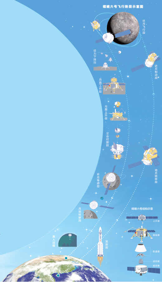 嫦娥五號探測器擁有“往返票”:在完成樣品采集后,還需將月球樣品帶回地球。23天時間、11個重大階段和重要步驟,科研人員迎難而上,創(chuàng)造了在地外天體的采樣與封裝等5項“中國首次”。