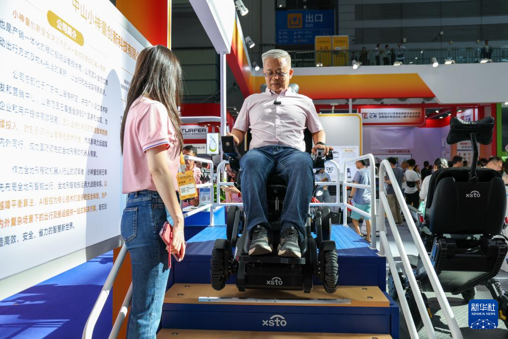 9月12日,觀眾在國際智慧養(yǎng)老產(chǎn)業(yè)博覽會現(xiàn)場體驗智能出行機器人。新華社記者 梁旭 攝