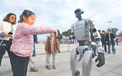 10月25日,江蘇省揚(yáng)州市公安局在揚(yáng)州市明月湖廣場舉行警營開放日活動,現(xiàn)場設(shè)立多個主題互動展區(qū),市民可以近距離接觸警務(wù)裝備。圖為人形機(jī)器人與小朋友互動。孟德龍攝(人民視覺)