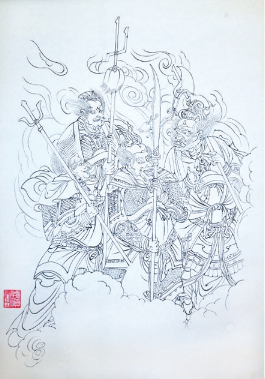 更令李向東醉心不已的是,壁畫(huà)中人物衣袖明明是靜態(tài),卻似乎被微風(fēng)吹動(dòng)、卷起形成鼓動(dòng)之勢(shì),仿佛下一秒就要隨風(fēng)起舞。在靜止的壁畫(huà)中,畫(huà)師勾勒出搖動(dòng)的扇面、飛舞的發(fā)絲,以及在眾仙家之間縹緲虛幻的云海,創(chuàng)造了靈動(dòng)出畫(huà)的動(dòng)態(tài)美。眾神佛道三五成群,看似錯(cuò)落隔離,卻又遙相呼應(yīng),彼此相望,顧盼生輝,呼之欲出。在人物群像中,李向東對(duì)金剛座神的畫(huà)法最為推崇——面目粗獷,體格魁偉,毛發(fā)濃密,一雙銅鈴般的眼睛微微斜視,須眉怒張,威風(fēng)凜凜。身體重心偏向一側(cè),一手持金剛杵于肩頭,一手探掌護(hù)于胸前,全身肌肉緊繃,顯示出畫(huà)師對(duì)線條的熟練運(yùn)用和高超的造型能力。