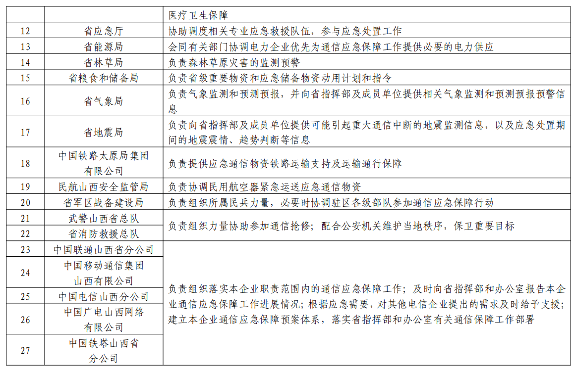 成員:省通信管理局、省委宣傳部、省委網(wǎng)信辦、省發(fā)展改革委、省公安廳、省財(cái)政廳、省自然資源廳、省交通廳、省水利廳、省衛(wèi)健委、省應(yīng)急廳、省能源局、省林草局、省糧食和儲(chǔ)備局、省氣象局、省地震局、中國鐵路太原局集團(tuán)有限公司、民航山西安全監(jiān)管局、省軍區(qū)戰(zhàn)備建設(shè)局、武警山西省總隊(duì)、省消防救援總隊(duì)以及省基礎(chǔ)電信企業(yè)等部門單位相關(guān)負(fù)責(zé)人。
