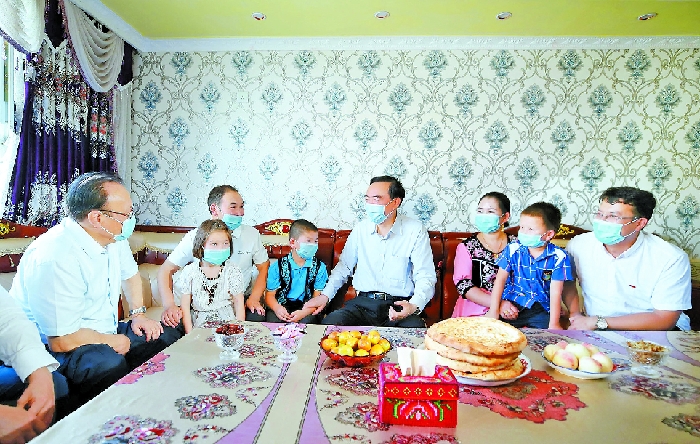 日前,自治區(qū)黨委書記陳全國,自治區(qū)黨委副書記、自治區(qū)主席雪克來提·扎克爾在克孜勒蘇柯爾克孜自治州調(diào)研統(tǒng)籌推進(jìn)常態(tài)化疫情防控和經(jīng)濟(jì)社會發(fā)展工作。這是陳全國、雪克來提·扎克爾在阿克陶縣絲路佳苑易地扶貧搬遷安置點(diǎn),走進(jìn)建檔立卡貧困戶穆拉提·艾海提家中,關(guān)心詢問搬遷后的生活情況,勉勵他們持續(xù)增收致富,把日子越過越好。 崔志堅(jiān)攝