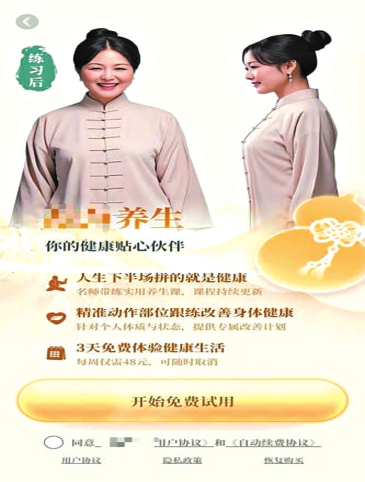 還有些App則更加離譜,下載完成后,點(diǎn)進(jìn)去的第一步就是要購(gòu)買會(huì)員,之后才能正常使用。但在購(gòu)買流程上,平臺(tái)卻耍起了花招。比如一款提供“養(yǎng)生指導(dǎo)服務(wù)”的App,頁(yè)面上會(huì)有一個(gè)大大的按鈕,寫(xiě)著“開(kāi)始免費(fèi)試用”。但在按鈕的旁邊,卻有一行非常不起眼的小字:“每周僅需48元,可隨時(shí)取消。”而一旦用戶點(diǎn)擊開(kāi)始試用,系統(tǒng)就會(huì)跳轉(zhuǎn)到自動(dòng)續(xù)費(fèi)的開(kāi)通界面。如果是辨別能力差的老人,可能還以為是在填寫(xiě)什么注冊(cè)信息。