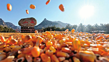 從空中俯瞰,景區(qū)標(biāo)志性的刻有“藏山”字樣的巨石,被連片的玉米“花?!杯h(huán)繞,綿延千米的道路上,玉米粒被村民們精心鋪成整齊的波紋狀,宛如一條流淌的金色長(zhǎng)河?!敖衲昃皡^(qū)把這么寬的路讓給我們晾曬糧食,真的解決了我們一大難題!”正在翻曬玉米的村民李師傅說(shuō)道。