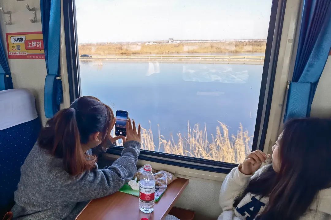 列車駛出運城站,工作人員開始為旅客熱心介紹打卡拍照的最佳地點和周邊的名勝古跡,并且精心準(zhǔn)備了小道具,方便大家打卡拍照。 水上美景:夢幻+浪漫 約9時52分 列車運行至硝池灘 旅客仿佛置身于 大美山水畫卷之中
