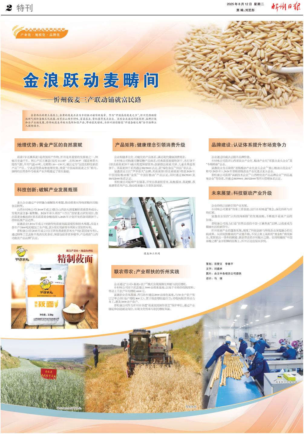 在晉西北的黃土高原上,金黃的莜麥正在為鄉(xiāng)村振興譜寫新篇章。作為“中國高原莜麥之鄉(xiāng)”,忻州憑借獨特地理氣候和雜糧文化底蘊,培育出山西鄉(xiāng)村味、富鑫農(nóng)業(yè)、晉粒康等龍頭企業(yè)。這些企業(yè)通過科技創(chuàng)新、品牌打造和全產(chǎn)業(yè)鏈發(fā)展,將傳統(tǒng)莜麥升級為高附加值產(chǎn)品,帶動農(nóng)民增收,為忻州持續(xù)擦亮“中國雜糧之都”金字招牌注入強勁動力。