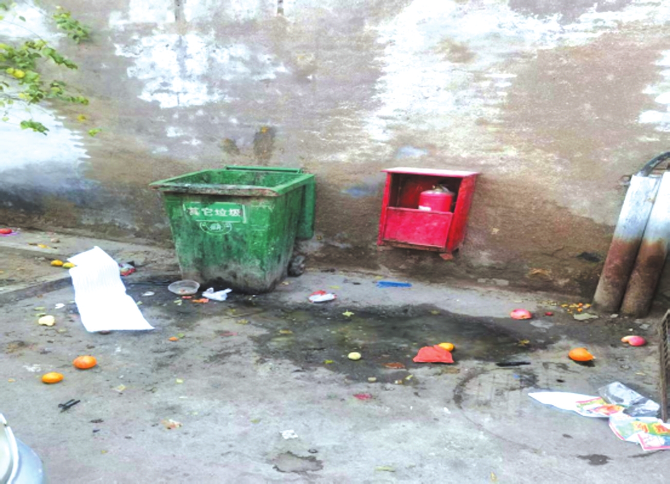 忻府區(qū)和平東街農貿市場垃圾箱臟亂、消防器材缺失。