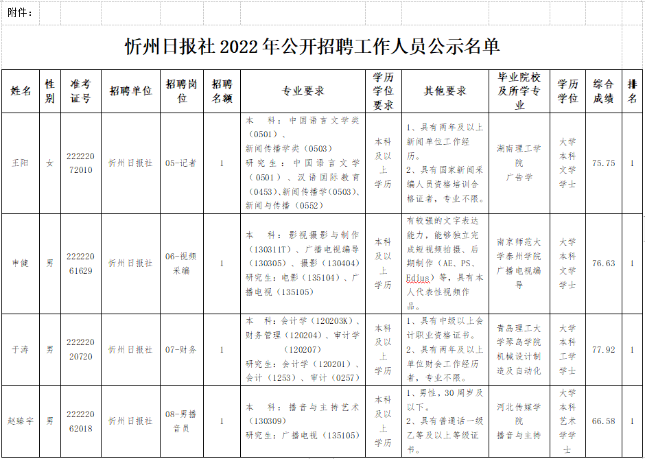 附件: 忻州日?qǐng)?bào)社2022年公開招聘工作人員公示名單