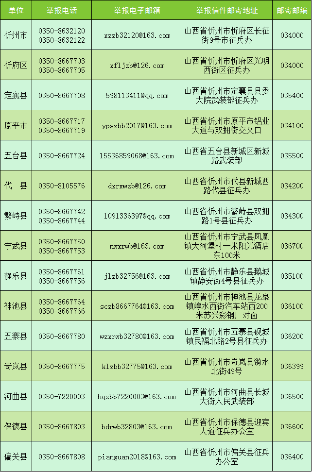 為認(rèn)真貫徹落實(shí)上級關(guān)于廉潔征兵的政策規(guī)定,維護(hù)廣大應(yīng)征青年的合法權(quán)益,嚴(yán)明征兵紀(jì)律,拓寬監(jiān)督渠道,營造風(fēng)清氣正的征兵環(huán)境,現(xiàn)將2025年忻州市級廉潔征兵監(jiān)督員和市縣兩級舉報(bào)電話、郵箱等信息予以公示,歡迎全社會(huì)對征兵工作進(jìn)行監(jiān)督。