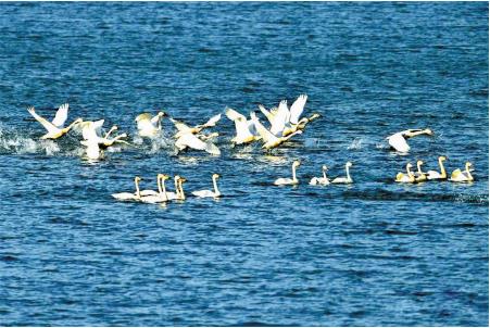 春日里的暖陽將河水消融,雙乳湖上的白天鵝美得讓人沉醉。它們是大自然的精靈,用頎長的脖頸搖撼著冬日的死寂,用輕盈的羽扇靈動了粼粼蕩漾的河面,用點點乳白畫出了繁花似錦的春天。