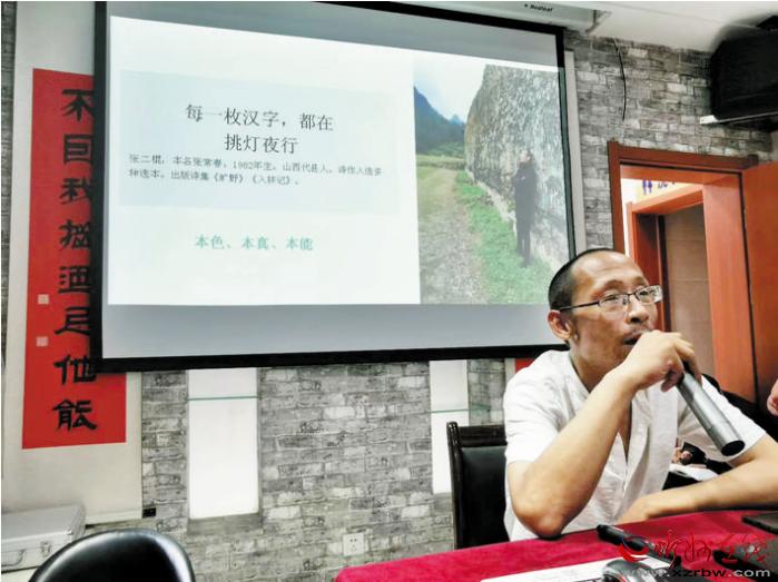 本報(bào)訊 8月15日晚,位于忻州市七一北路的好目匠眼鏡店迎來一場文學(xué)盛會(huì)。保德縣、岢嵐縣、五寨縣、原平市、定襄縣的詩歌愛好者,與忻州城區(qū)的詩歌愛好者一起聆聽了著名詩人張二棍關(guān)于詩歌創(chuàng)作的講座,甚至有詩歌愛好者專門從北京趕回忻州。當(dāng)晚,連講座廳外都站滿了聆聽的人。