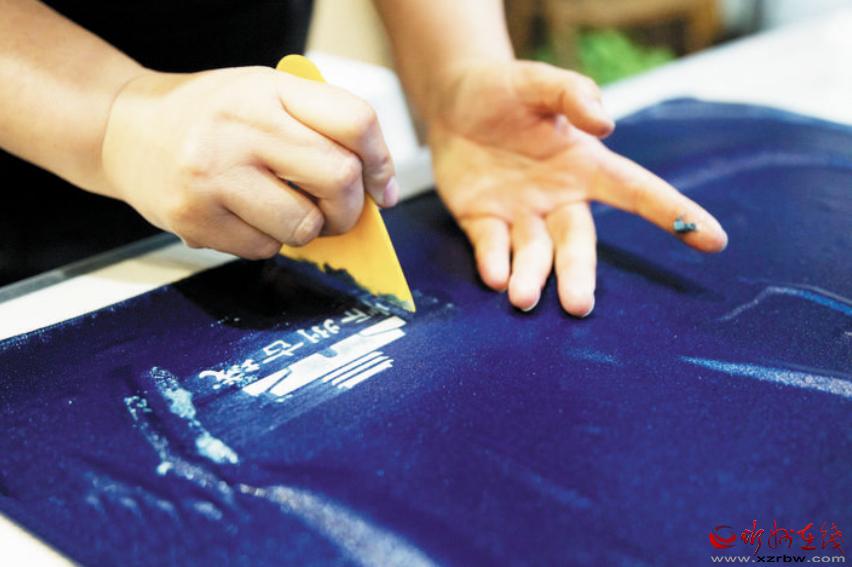 灰纈的最后一步是刮漿。由于灰漿的保護(hù),設(shè)計(jì)好的圖案得以在染好的布料上被保留下來,形成好看的圖樣及花式。