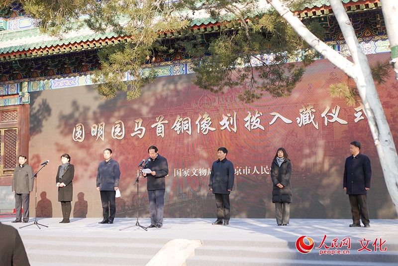 人民網(wǎng)北京12月1日電(韋衍行) 12月1日上午9時,國家文物局、北京市人民政府在圓明園正覺寺舉行圓明園馬首銅像劃撥入藏儀式。國家文物局正式將圓明園馬首銅像劃撥北京市海淀區(qū)圓明園管理處收藏,馬首成為第一件回歸圓明園的流失海外重要文物,《百年夢圓——圓明園馬首銅像回歸展》同期開展。