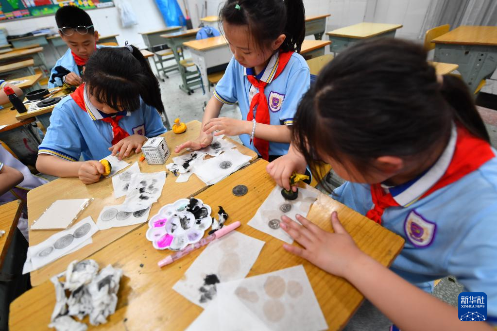 5月15日,在長沙市天心區(qū)紅衛(wèi)小學(xué),學(xué)生在拓印課上體驗拓印制作。
