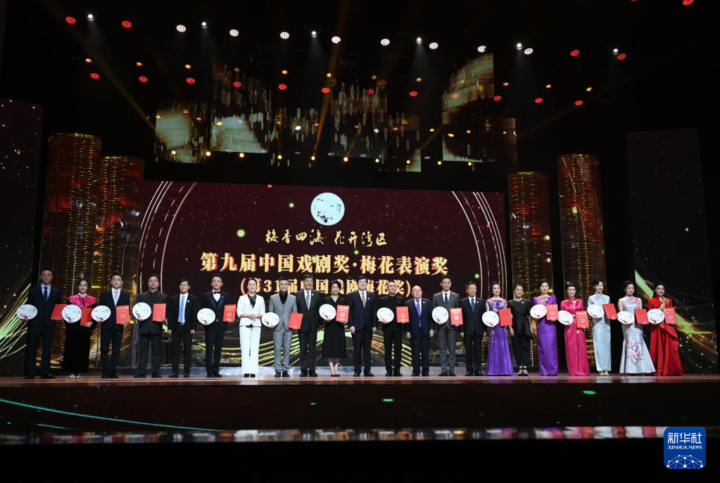 當(dāng)晚,第九屆中國(guó)戲劇獎(jiǎng)·梅花表演獎(jiǎng)(第31屆中國(guó)戲劇梅花獎(jiǎng))和第九屆中國(guó)戲劇獎(jiǎng)·曹禺劇本獎(jiǎng)(第25屆曹禺戲劇文學(xué)獎(jiǎng))頒獎(jiǎng)典禮在廣州舉行。新華社發(fā)(許建梅攝)