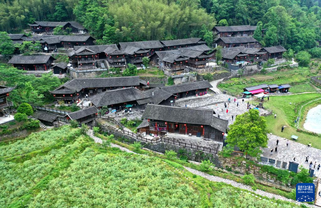 位于湖北省宣恩縣沙道溝鎮(zhèn)的彭家寨古吊腳樓群歷史悠久,吊腳樓保存完好,古樸雅致,是當(dāng)?shù)孛袼孜幕糜蔚臒衢T打卡地(5月2日攝,無(wú)人機(jī)照片)。
