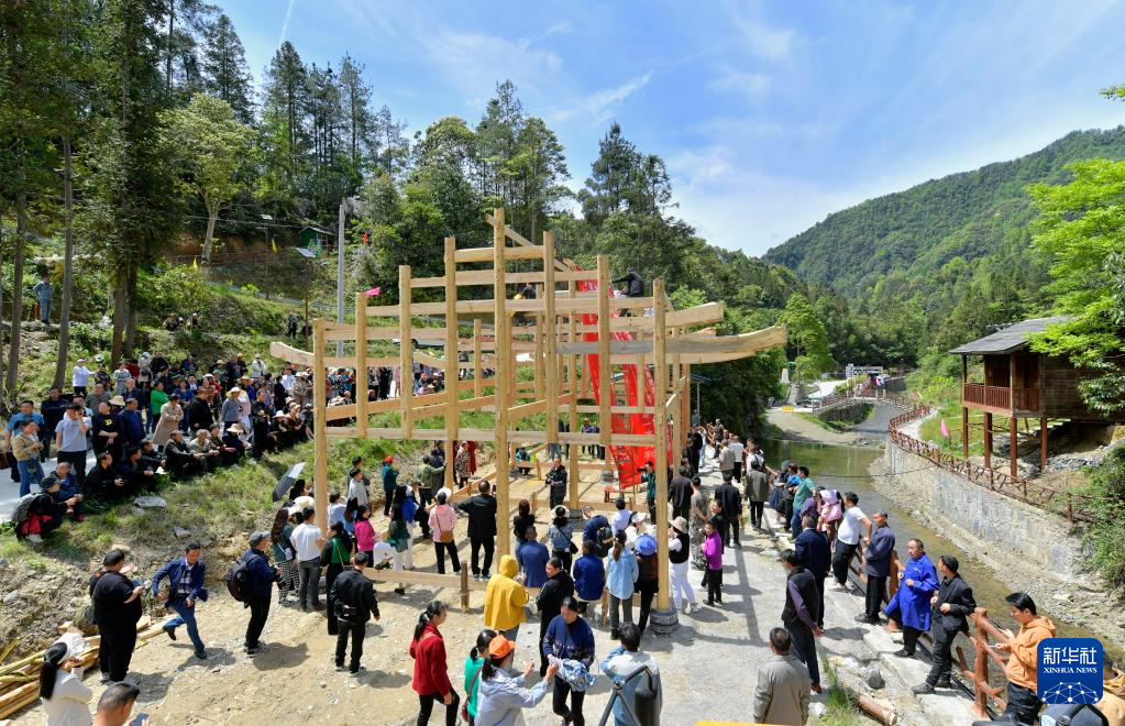 4月26日,在湖北省宣恩縣沙道溝鎮(zhèn)老岔村,村民在舉行吊腳樓落成儀式。