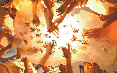 非遺傳承人給學生展示傳統(tǒng)皮影。張建益 攝