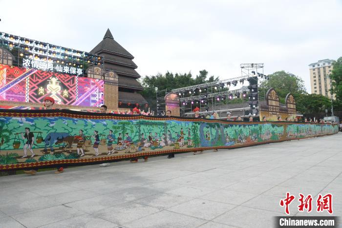 4月11日,2024年海南黎族苗族傳統(tǒng)節(jié)日“三月三”節(jié)慶活動主會場開幕式暨文藝演出在保亭黎族苗族自治縣舉行。圖為黎族民俗風情黎錦長卷展示。張月和 攝 據(jù)介紹,黎族民俗風情黎錦長卷長186.7米、寬1.38米,采用黎族紡織技藝“通經(jīng)斷緯法”織造,由十余名黎族織錦文化傳人、歷時近3年共同制作完成。內(nèi)容包括黎族傳統(tǒng)生產(chǎn)生活、婚俗、制陶等12部分,共呈現(xiàn)50多個畫面、598個人物,是一幅了解海南黎族傳統(tǒng)文化的歷史畫卷。 當晚的長桌宴吸引許多民眾參加,人們身著黎族苗族服飾,沿長桌對坐,吃三色飯、品山蘭酒。來自美國的Marian Deborah Rosenberg(瑪麗安·黛博拉·羅森伯格)亦身穿黎族服飾赴宴,她喜歡黎錦艷麗的色彩,長桌宴這種特殊的用餐形式讓她感受到節(jié)日的氛圍,“人們與親友聚在一起祝酒說笑,熱鬧又開心”。