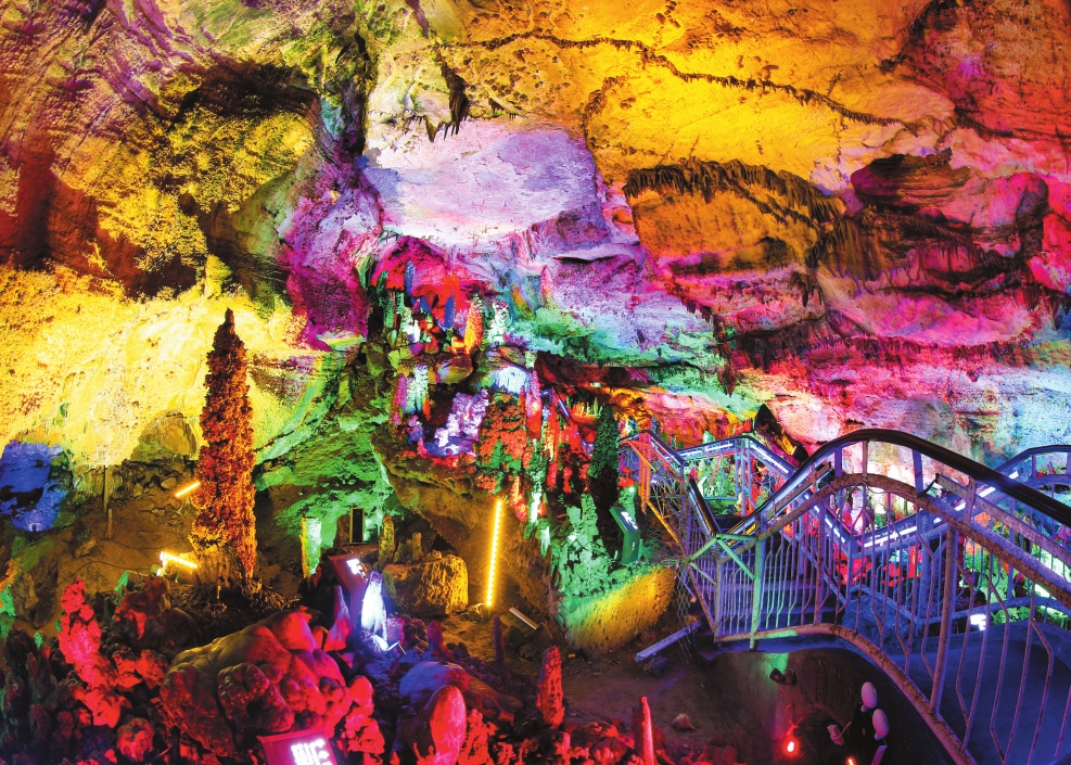 游客沿著精心設(shè)計(jì)的路線,可觀賞50多個(gè)景點(diǎn)。其中“群獅迎賓”,洞口一組石筍形似雄獅列隊(duì),栩栩如生;“金龜出洞”,巨石形成的龜狀奇石,仿佛正探秘人間;“瑤池仙境”與“蓬萊仙島”,燈光下的石幔如天宮云霞;“鎮(zhèn)海寶塔”,高1.8米的花團(tuán)狀石塔,景象奇麗。最令人驚嘆的是洞內(nèi)的“冰瀑世界”。在水晶洞和一線天區(qū)域,巖溶從洞頂傾瀉而下,形成各種瀑布奇觀:有如長(zhǎng)白山瀑布的白練懸空,有如黃果樹瀑布的氣勢(shì)恢宏,還有黃巖大瀑布的玲瓏剔透。一處名為“禹王觀瀑”的景點(diǎn),更讓游人仿佛看見(jiàn)大禹治水時(shí)三過(guò)家門而不入的身影。