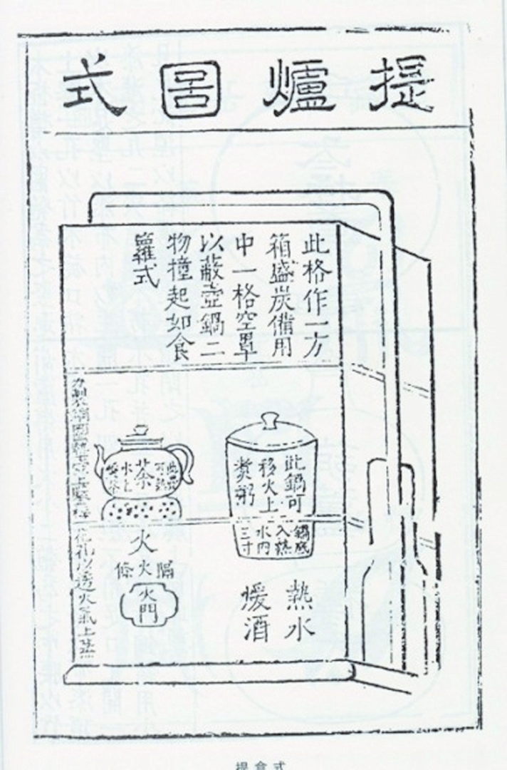 根據文字與插圖可以看出,提爐的靈感來自當時普遍使用的“三撞”,即三層式提盒,由可以靈活組裝或分卸的幾部分組成,包括一個帶有底座的提梁架、兩層方屜盒、一個四方形圍框,以及一只銅質四方形的水火爐。兩層屜盒與四方形圍框在外徑上尺寸一致,且彼此采用子母口套合,可以按照一層屜盒在下、四方形圍框在中、一層屜盒在上的形式疊置,并依靠子母口嵌合牢固。下層方屜盒的外徑尺寸要與提梁架底座上的淺凹槽正好相當,這樣在移動過程中,屜盒就能牢固嵌置在底座的凹槽內,不會脫落。整套配置中最重要的組件是一只小銅火爐,這只銅爐亦為四方形,外徑與下層屜盒的內徑相當,可以恰好放置在屜內,不會晃動。此爐之所以名為“水火爐”,是因為爐體的內部用銅板隔為左右兩個用途不同的區(qū)域,分別發(fā)揮煮水風爐與燙酒器的功能。左半部的頂面安有圓形灶,可以放入火炭,在其側壁上則開有火門,用以通風、清灰,因此只要將特制的茶壺置于灶上,就可以隨時生火煮水,沖茶品茗;右半部則僅在頂面開有一個圓口,使用的時候通過圓口向內注入熱水,然后把一只與圓口大小相配的帶蓋小桶放入其中,再把酒注入小桶,將酒燙熱。小桶是為了組合方便精心設計的,還可以擔任袖珍煮鍋的角色,故《遵生八箋》中稱其為“小鑊”。游玩中肚子餓時,還可以隨時把這只小桶放到灶口上,煮粥或者其他便于快速制作的飲食,就地來一頓野餐。
