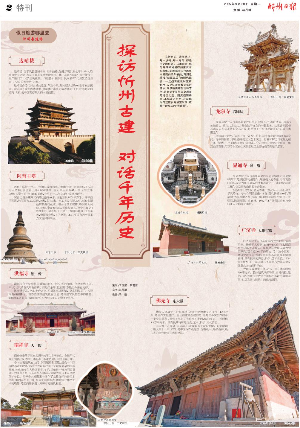 在忻州的廣袤土地上,每一塊磚、每一片瓦,都是歷史的低語。從南禪寺、佛光寺榫卯間留存的唐代木構(gòu)風(fēng)華,到洪福寺宋代雕塑中凝固的千年佛韻,再到邊靖樓“威鎮(zhèn)三關(guān)”的明代雄姿……這些古建似時(shí)空的切片,或見證著佛教文化的傳承,或以精美雕塑詮釋藝術(shù),是感受千百年歷史厚重的絕佳之選。國慶假期將至,不妨走進(jìn)忻州,在凝眸間與過往歲月隔空對(duì)話,收獲一段難忘的“古建游”。 邊靖樓 邊靖樓,位于代縣縣城中央,俗稱鼓樓,始建于明洪武七年(1374),取靖邊安民之意,為全國重點(diǎn)文物保護(hù)單位。樓上高懸“聲聞四達(dá)”“威鎮(zhèn)三關(guān)”“雁門第一樓”三塊匾額。與應(yīng)縣木塔齊名,民間素有“代州鼓樓應(yīng)州塔,正定府的大菩薩”之稱。 邊靖樓作為代州古城的象征,氣勢(shì)非凡,結(jié)構(gòu)堅(jiān)實(shí),歷500余年巍然挺立。在萬里長(zhǎng)城關(guān)隘塞樓中,邊靖樓比山海關(guān)靖邊樓高15米,比嘉峪關(guān)城樓高17米,是中國現(xiàn)存最大的木質(zhì)鼓樓。 阿育王塔 阿育王塔位于代縣上館鎮(zhèn)縣政府后院。始建于隋仁壽元年(601),初為木結(jié)構(gòu),唐會(huì)昌五年(845)被毀,唐大中元年(847)、宋元豐三年(1080)、崇寧元年(1102)重建,元至元十二年(1275)改建為磚塔。 阿育王塔為喇嘛式磚塔,通高40米,占地面積1876平方米。塔平面呈圓形,磚石砌臺(tái)基,底徑20米,高1.5米。臺(tái)基上設(shè)束腰基座,刻有仰覆蓮瓣及纏枝花紋。塔身為圓形覆缽,塔剎分為剎座、相輪、傘蓋和寶珠,剎座須彌式,座中心矗立1鐵質(zhì)剎桿,砌相輪十三層,上置圓形露盤,狀為傘蓋,極頂置寶珠,上下疊置。2001年公布為全國重點(diǎn)文物保護(hù)單位。 洪福寺 塑像 洪福寺位于定襄縣宏道鎮(zhèn)北社東村中,坐北向南。創(chuàng)建年代不詳,宋、元、明、清各代均有修葺。歷經(jīng)千余年,惟正殿、東殿至今保存完好。 該寺建于高7米的土臺(tái)之上,四周筑高堡圍墻,“踞高而臨深”。大殿內(nèi)有磚砌佛壇。該寺塑像較建筑更有價(jià)值,是我國宋代雕塑中的精品。2001年6月25日,被國務(wù)院公布為全國重點(diǎn)文物保護(hù)單位。 南禪寺 大殿 南禪寺坐落于五臺(tái)縣西南的陽白鄉(xiāng)李家莊。創(chuàng)建年代缺乏文獻(xiàn)記載,寺內(nèi)幾塊明清記事碑文,都記載為創(chuàng)建于唐。 寺內(nèi)主要建筑有山門、東西配殿和正殿,組成一個(gè)四合院形式的院落,其唐代大殿為我國已知現(xiàn)存最早的木構(gòu)建筑,比佛光寺東大殿還要早75年,其他殿宇皆為明清重建。1961年3月,國務(wù)院公布南禪寺大殿為全國重點(diǎn)文物保護(hù)單位。南禪寺大佛殿集中保存了完整良好的唐代木結(jié)構(gòu),殿內(nèi)泥塑十七尊,與建筑同期塑造,堪稱唐代雕塑藝術(shù)的臻品,是國內(nèi)除敦煌以外稀有的唐代彩塑。 龍泉寺 石牌坊 龍泉寺位于五臺(tái)山風(fēng)景名勝區(qū)中臺(tái)頂腳下,九道嶺拱抱,從山形地貌看去,像有九龍齊頭并身會(huì)飲于寺東的一眼泉水。這里曾回蕩著石雕匠人刀刻斧鑿的金石之音,也孕育了一座鐘靈毓秀的“石雕藝術(shù)殿堂”。 該寺建于宋代。全寺占地1.59萬平方米,共有各種殿堂僧舍160余間。寺中的影壁、牌坊、墓塔是三大藝術(shù)瑰寶。影壁和牌坊與東院處在一條中軸線上,由108級(jí)石板臺(tái)階相連。臺(tái)階底部的照壁正中所嵌一組漢白玉石雕,可以看作五臺(tái)山風(fēng)景名勝區(qū)主要寺廟的微縮示意圖。 顯通寺 銅塔 顯通寺位于五臺(tái)山風(fēng)景名勝區(qū)臺(tái)懷鎮(zhèn)中心區(qū)靈鷲峰腳下,是景區(qū)歷史最悠久、規(guī)模最大的寺廟,與河南洛陽白馬寺同為我國最早的佛教寺院之一,被稱作“釋源宗祖”,也是五臺(tái)山佛教協(xié)會(huì)駐地。 據(jù)《清涼山志》載,顯通寺建于東漢永平年間,稱大孚靈鷲寺。寺內(nèi)存明清塑像411尊,現(xiàn)代佛像200尊,明清碑17通,銅塔5座,木塔1座,明版大藏經(jīng)3210冊(cè)。有明清、民國時(shí)期古樹26株。1982年2月國務(wù)院公布為全國重點(diǎn)文物保護(hù)單位。 廣濟(jì)寺 大雄寶殿 廣濟(jì)寺位于五臺(tái)縣城內(nèi)西大街北側(cè),俗稱西寺。始建于元至正(1341—1368)年間,明清兩代局部予以修葺?,F(xiàn)存建筑大雄寶殿為元代原構(gòu),已有近700年的歷史,為廣濟(jì)寺正殿,是研究我國元代建筑和泥塑不可多得的實(shí)物資料,具有較高的歷史、科學(xué)、藝術(shù)價(jià)值。2001年6月25日,廣濟(jì)寺被國務(wù)院公布為第五批全國重點(diǎn)文物保護(hù)單位。 大雄寶殿面寬五間,進(jìn)深三間,建筑面積290平方米。整體建筑舉折平緩,古樸典雅,雄偉壯觀,為我國元代木結(jié)構(gòu)精巧方法的真實(shí)寫照,也是我國古建筑中的獨(dú)特范例。 佛光寺 東大殿 佛光寺坐落于五臺(tái)縣豆村,創(chuàng)建于北魏孝文帝(471—499)時(shí)期,是世界文化遺產(chǎn)五臺(tái)山的重要組成部分,也是國務(wù)院公布的第一批全國重點(diǎn)文物保護(hù)單位。寺院坐東朝西,依山而造,占地面積3.4萬平方米。具有極其特殊的歷史、藝術(shù)、科學(xué)、文化價(jià)值。 寺內(nèi)有三進(jìn)院落,層層遞升,最頂端是主殿東大殿。東大殿建于唐大中十一年(857),是中國保存最完整、規(guī)模最大、等級(jí)最高、最