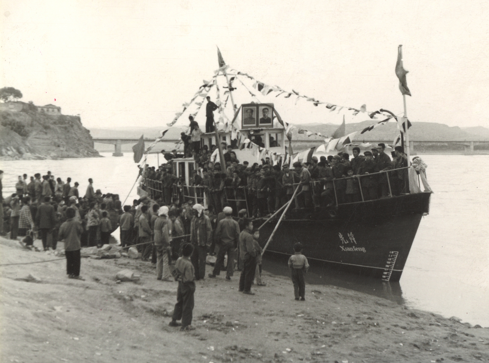 群眾在黃河邊圍觀保德縣設(shè)計制造出的第一艘“先鋒號”船