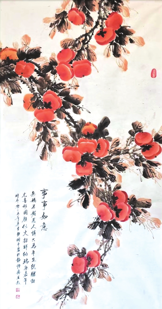 在樊國(guó)平眾多題材探索中,《事事如意》系列柿子圖可謂其藝術(shù)精神與人生哲思的縮影。這些作品超越了尋?;B(niǎo)畫(huà)的怡情悅性,成為她寄托情懷、叩問(wèn)生命的重要載體。畫(huà)中那一串串、一簇簇丹柿,色澤溫潤(rùn),形態(tài)豐盈,承載著諧音“事事如意”的吉祥寓意,滿足了社會(huì)對(duì)美滿生活的樸素祈愿。她以此通俗意象為入口,引領(lǐng)觀者步入一個(gè)融匯儒、道、佛哲學(xué)理念的深邃境界,實(shí)踐著中國(guó)藝術(shù)“技進(jìn)乎道”“以畫(huà)載道”的至高追求。